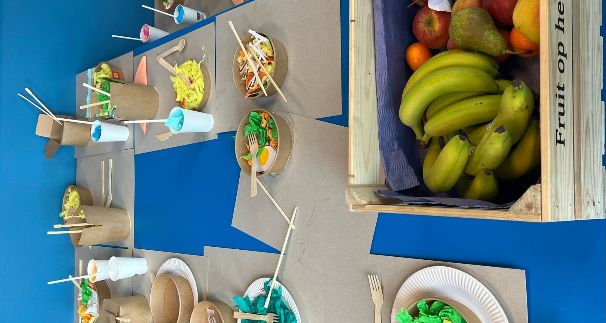 Onder leiding van Claartje Auf dem Brinke, educator van Kunstlinie, ontdekten de leerlingen de wereld van beeldende kunst en gezonde voeding. Ze bekeken hoe voeding in verschillende culturen een rol speelt en vertaalden dit naar hun eigen kunstwerken. Met materialen als wol, papier en karton ontstonden de meest creatieve gerechten: van borden vol spaghetti van wol tot vorken waar de soep vanaf droop.